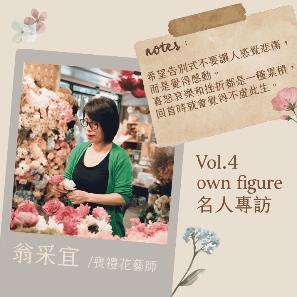 有感於殯葬產業的傳統和諸多限制,翁采宜決定打破禁忌的僵局,創辦「花回想」花藝品牌,以花為載體,寄託有關逝者的種種回憶,也存放自我生命中的獨特故事,儘管生命消逝,回憶與感動永不止息。