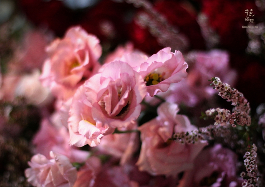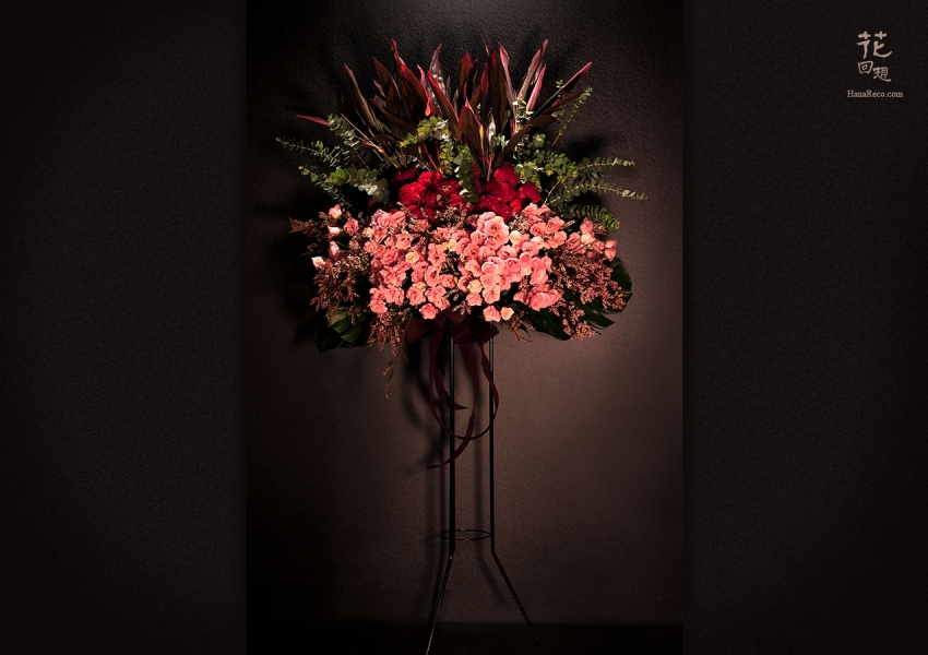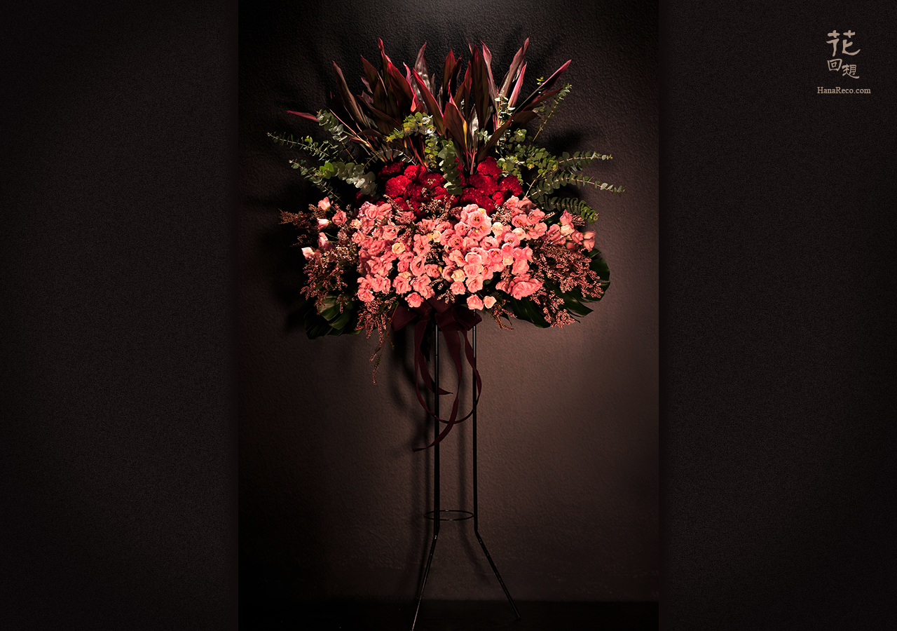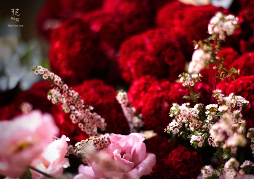 花材:紅雞冠x2把、粉桔梗x2把、史考梅x2把、紅竹x1把、尤加利x2小把、大電信葉x5片
