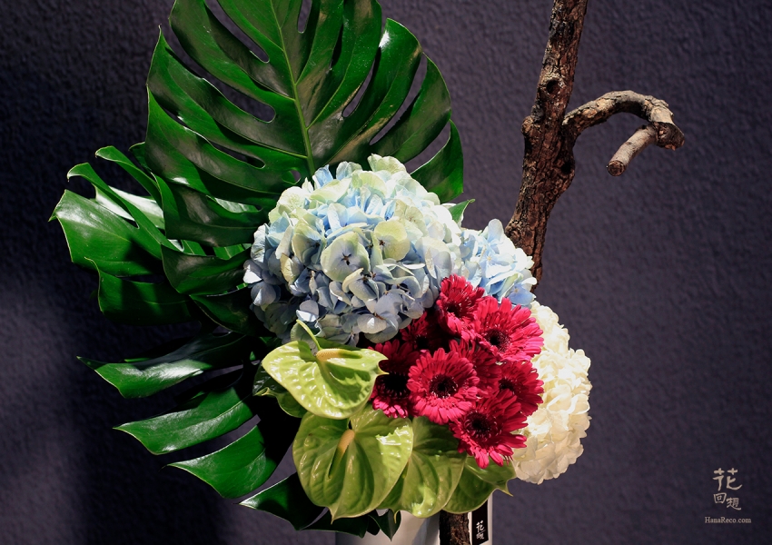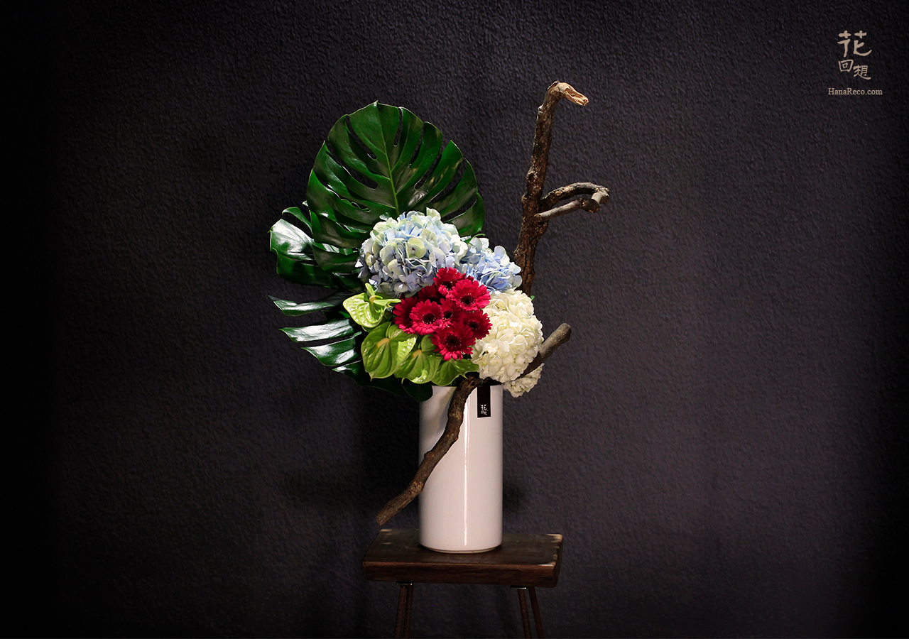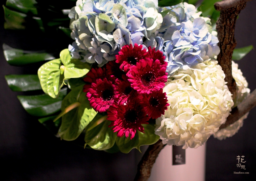 內容物:藍繡球x2支、白大康x1把、桃粉太陽x1、綠火鶴x5支、大電信葉x2片、木條x2支、花器、海綿